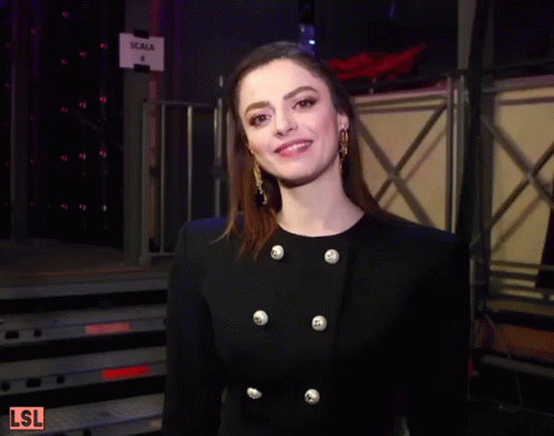 Annalisa makes an expressive 'Uà' gesture while speaking, wearing a black jacket with gold buttons.
