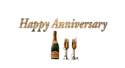 A festive image wishing 'Happy Anniversary' with a bottle of champagne and two elegant flutes.