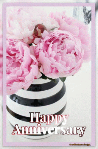 A beautiful bouquet of pink peonies in a black and white striped vase, wishing a Happy Anniversary.