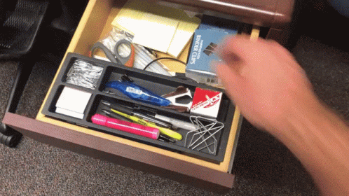 A hand demonstrates satisfying office drawer organization, revealing and tidying supplies with a thumbs up.