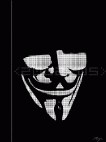 A black and white image featuring the iconic Anonimo (Guy Fawkes) mask, rendered with a pixelated effect.