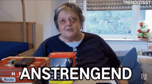 Gudrun, an elderly woman, looks stressed and says 'Anstrengend' (Exhausting).