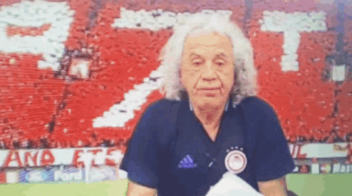 Takis Tsoukalas, the iconic Greek sports commentator, reacts passionately in front of a stadium backdrop.