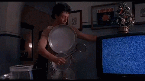 Massimo Ceccherini attempts to capture a TV signal using pots and pans as an antenna.