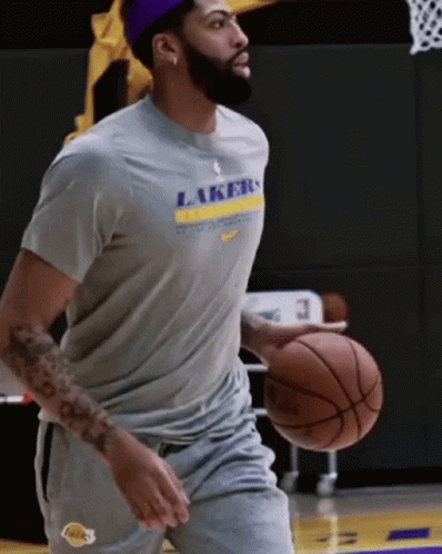 Anthony Davis of the Lakers practices dribbling a basketball on the court.