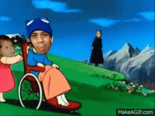 A little girl pushes Reonell Reyes in a wheelchair, then throws him out, with Tita B observing in the background.