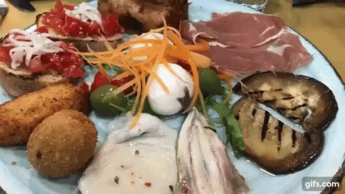 A vibrant Italian antipasto platter featuring mozzarella, prosciutto, grilled eggplant, bruschetta, and fried croquettes.