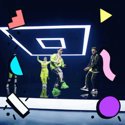 Anuel Aa and dancers perform on a stage with glowing neon geometric patterns, showcasing energetic trap moves.
