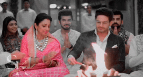Anupamaa and Anuj, along with others, participate in a traditional fire ritual, offering prayers.