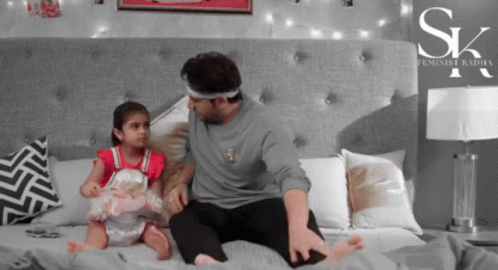 Anuj Kapadia and Chotianu share a sweet father-daughter moment on the bed, playfully mimicking each other.