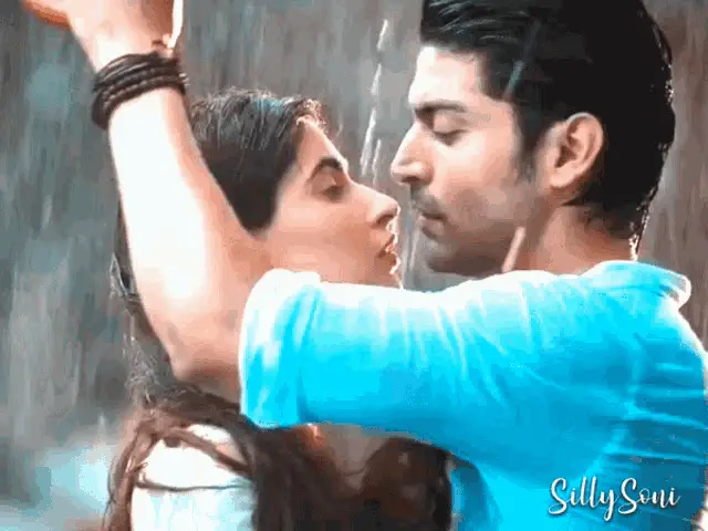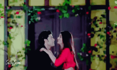 Anupre and Erica share a romantic moment, with the man lifting the woman amidst falling rose petals.