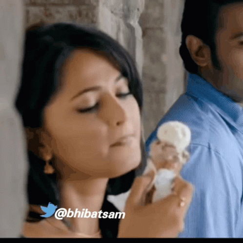 Anushka enjoying an ice cream cone, with the Twitter handle @bhibatsam visible on screen.