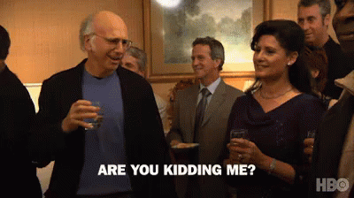 Larry David, from Curb Your Enthusiasm, asks 'Are you kidding me?' at a social gathering, expressing surprise.