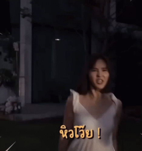 Aom Sushar makes a funny, hungry face while standing outside at night, expressing her hunger.