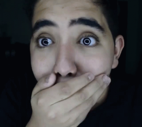 A man with wide eyes and an open mouth, covering his face in a moment of shock and disbelief.
