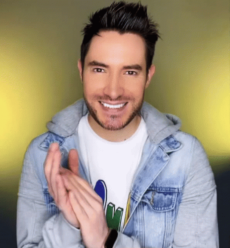Klehr claps enthusiastically, wearing a stylish denim jacket and a white t-shirt.
