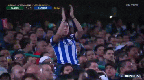 A passionate Rayados fan cheers enthusiastically during a Liguilla match, wearing a blue and white striped jersey.