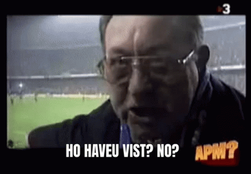 An angry man in glasses at a football stadium asks 'Have you seen it?' in Catalan, expressing frustration.