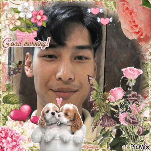 Apo Nattawin in a vibrant 'Good Morning' collage, surrounded by flowers, hearts, and cute puppies.