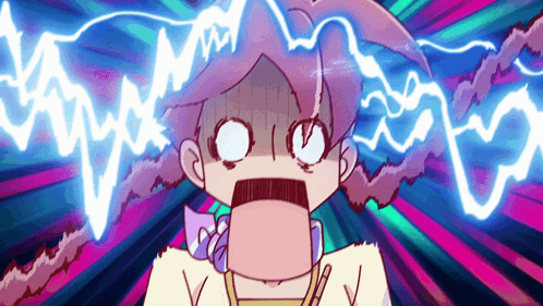 Yachiyo, the android girl from Apocalypse Hotel, looks utterly shocked and bewildered with lightning-like energy around her head.