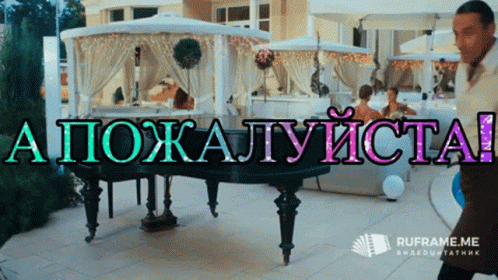 Kamil Larin from 'What Men Talk About' delivers the iconic 'A, please!' line next to a white piano in an outdoor setting.