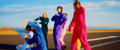 Appare idol group, featuring Asahina Rei, Fujimiya Mei, and others, performs a vibrant dance in colorful jumpsuits.