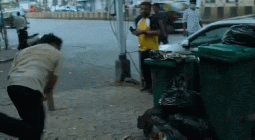 A man in a light shirt struggles with a green trash can on a city street, in content related to Applause Entertainment Rudra.