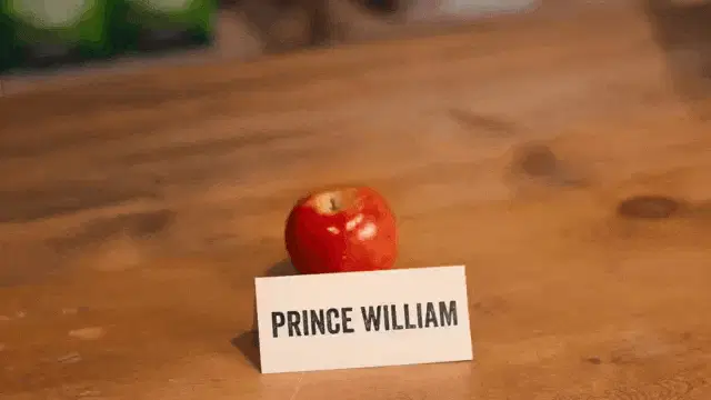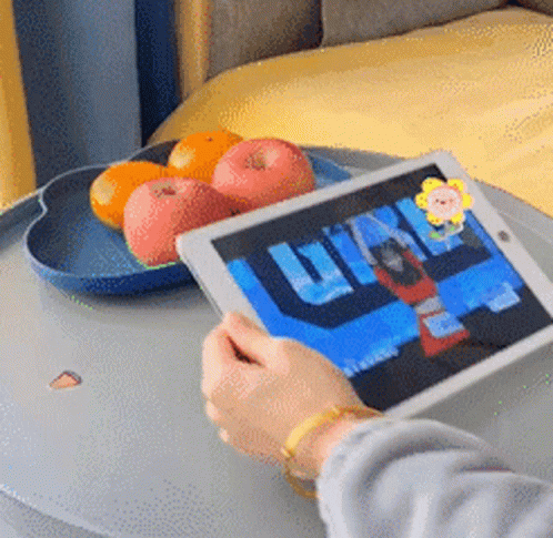 A person watches a video on a tablet, resting on a table next to a tray of fresh apples and oranges.