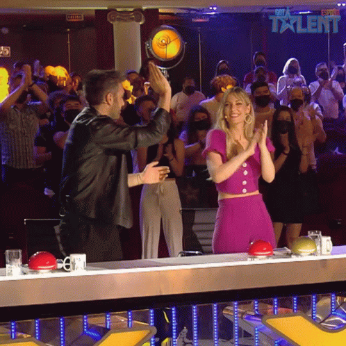 Dani Martínez and Edurne share a high five and a handshake on the set of Got Talent España, celebrating with the audience.