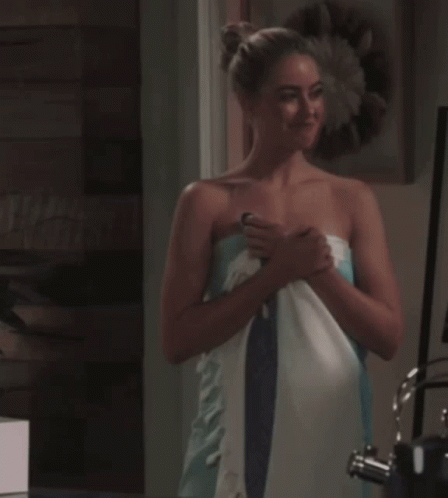 April Rose Pengilly as Chloe Brennan, wrapped in a blue and white towel, smiling.