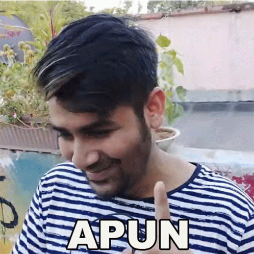 Abhishek Sagar smiles, pointing to 'APUN' on his striped shirt.
