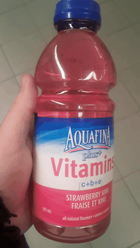 A hand holds a bottle of Aquafina Plus Vitamins, featuring Strawberry Kiwi flavor.