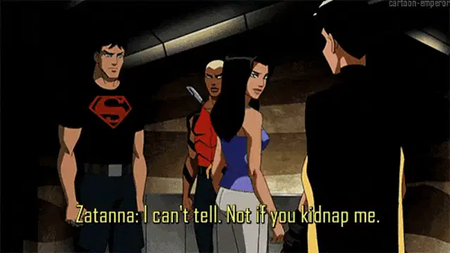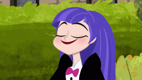 Zatanna, with purple hair and a tuxedo, smiles mischievously, ready for action.