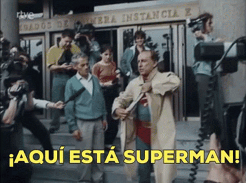 Ruiz Mateos dramatically reveals his Superman costume to a crowd of reporters, exclaiming 'Here is Superman!'