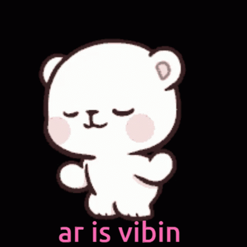 A cute white cartoon teddy bear character dancing happily with closed eyes, with the text 'ar is vibin' displayed below.