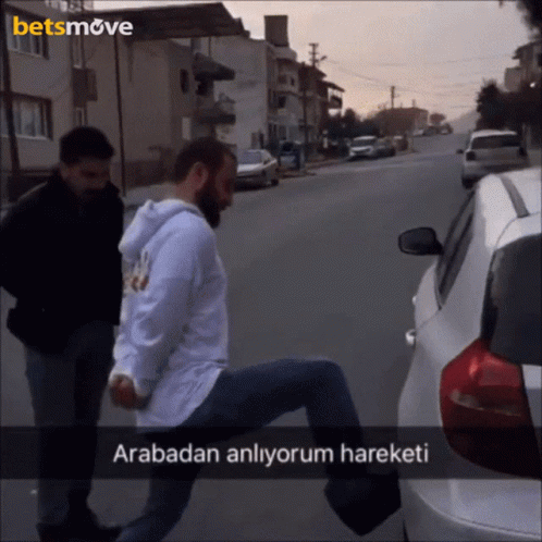 A man in handcuffs performs a humorous "car expert" gesture by kicking a car's tire on a street.