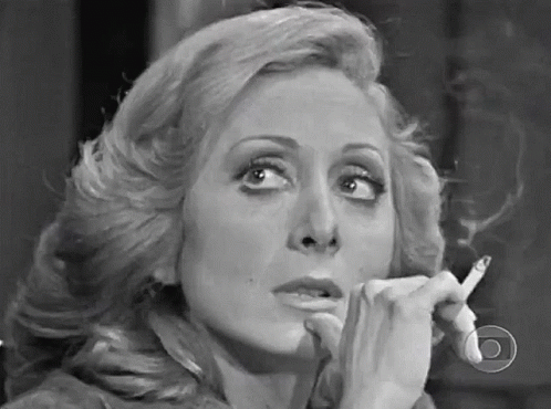 Aracy Balabanian as Aracu, smoking a cigarette in a classic black and white scene from a 70s production.