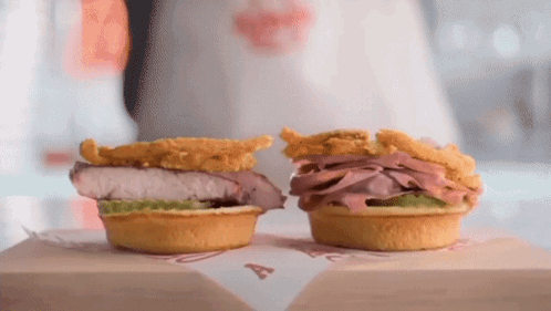 Two Arby's Bourbon BBQ Sliders, one with pork and one with roast beef, are shown on a cutting board.