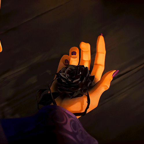 A hand with purple nail polish holds a black rose, which glows with arcane energy, featuring Leblanc from League of Legends.