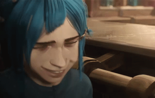 Arcane's Powder (Jinx) laughing heartily, with her signature blue hair.