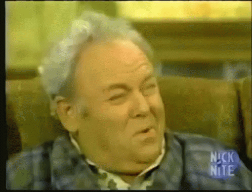 Archie Bunker from All in the Family laughing heartily while sitting in a chair, with a Nick at Nite logo visible.