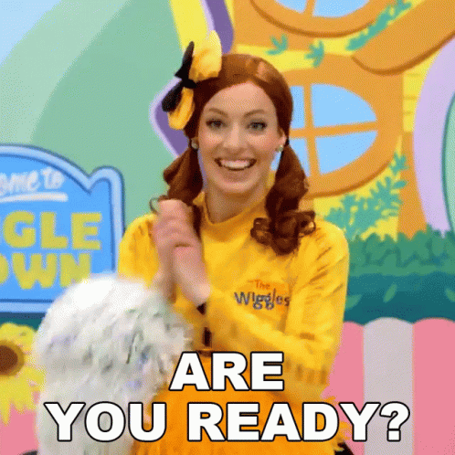 Emma Wiggle, played by Emma Watkins, smiles and asks 'Are You Ready?' while holding white and orange pom-poms.