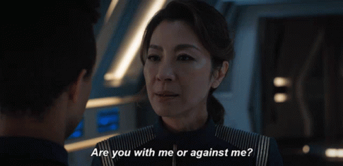 Emperor Philippa Georgiou confronts someone, asking 'Are you with me or against me?' in a tense moment.