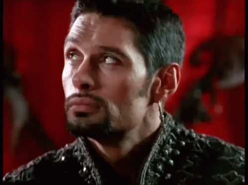 Kevin Tod Smith as Ares, the God of War, looking intently with a serious expression in his studded armor.