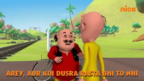 Motu and Patlu from the animated series discuss a problem, with Motu exclaiming, 'Arey, aur koi dusra rasta bhi to nhi' (Hey, there's no other way either).
