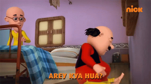 Motu Patlu cartoon scene where Patlu asks Motu, "What happened?" as Motu sits distressed on the floor.