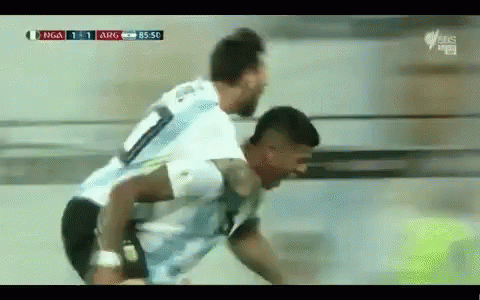 Lionel Messi celebrates a crucial goal with teammate Marcos Rojo for Argentina during a World Cup match.