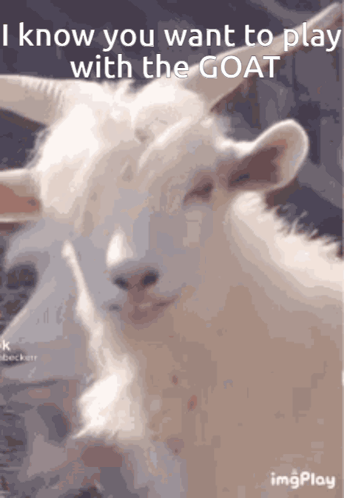 A charming goat looks directly at the camera with the playful caption 'I know you want to play with the GOAT'.