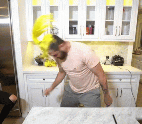 Julien Solomita whips bright yellow hair on his head in a kitchen, performing the "Ari Pony" dance.