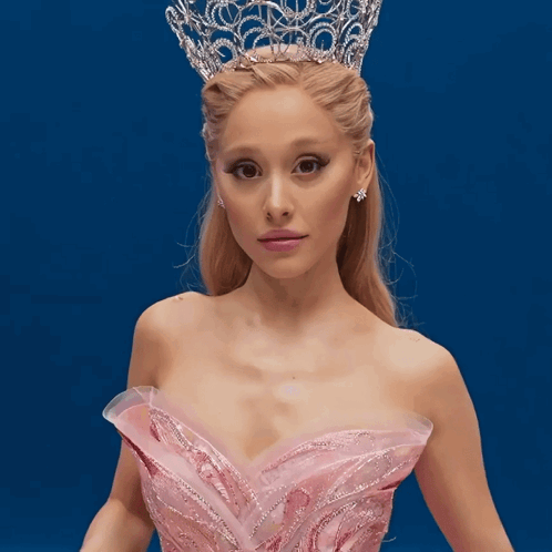 Ariana Grande as Glinda, wearing a sparkling pink gown and an elaborate silver crown.